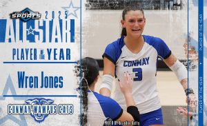 “Wren Jones has been a great player for us over the last four years,” said Conway head coach Laura Crow, who promoted Jones to the varsity as a freshman in 2022, marking the only time Crow has ever moved up a ninth grader. “She has put in a lot of work and time to develop into the six-rotation player to be a force for the Lady Wampus Cats. She has a true competitive spirit and can dial it up when the pressure is on. She has broken both the individual season and career records for kills at Conway High. Her drive and determination to be her best for her team is something I really admire.”